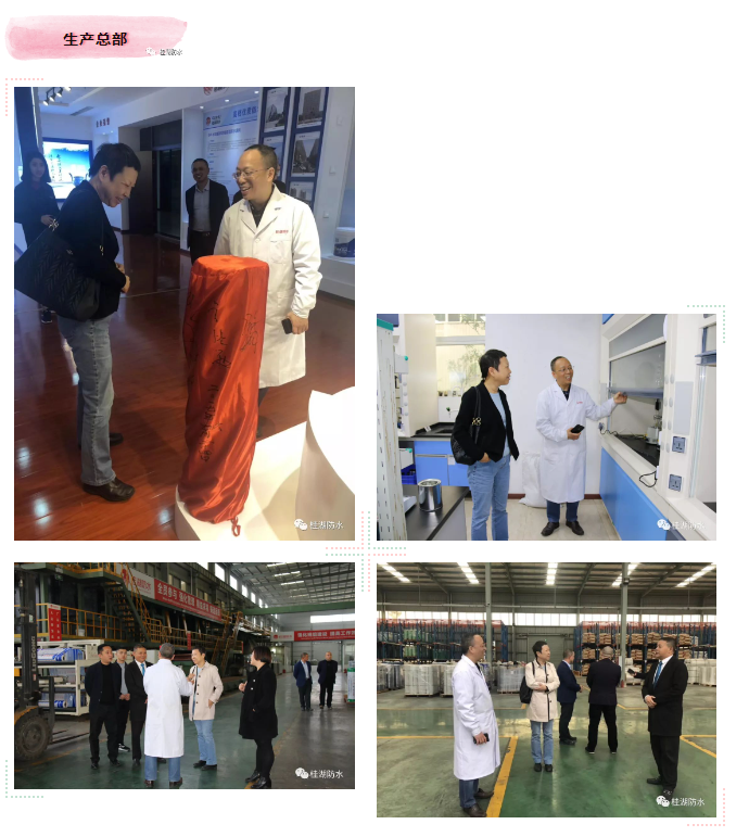 中國建筑防水協(xié)會苗燕副會長及成都賽特防水材料有限責(zé)任公司史文俊總經(jīng)理一行先后到公司總部、什邡生產(chǎn)基地進(jìn)行了實(shí)地參觀考察。在參觀過程中,對桂湖防水的集團(tuán)實(shí)力、品質(zhì)管控、環(huán)保要求等贊賞有加。